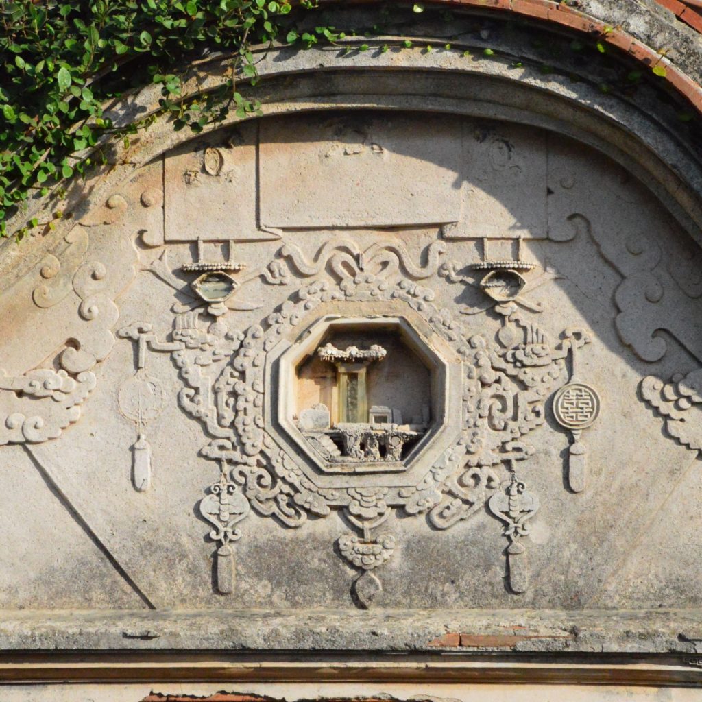 文化詞小教室 脊墜 jí zhuì 2021-05-31 2021-05-31 脊墜或稱鵝頭墜,位於閩南傳統建築的屋頂側面山牆上,與屋頂接合處施作灰塑,以防水與接合不同的材料。經能工巧匠塑造出不同的題材,一般多為包巾、蝙蝠、螭龍、罄牌、雲朵、八卦窗、掛飾等具有美好寓意的飾物。 作者:楊惠玲